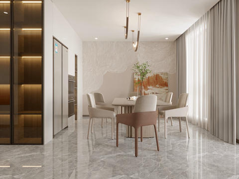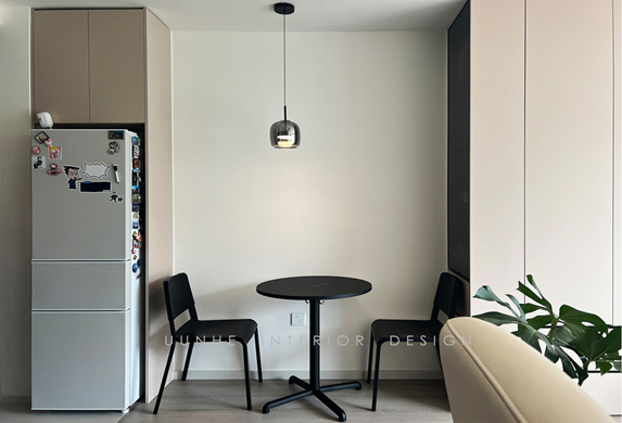 空間整體用色較為淡雅的奶白色 暖灰色系的柜體搭配鋼玻隔斷 餐桌吊燈+鋼玻裝飾柜形成空間一景 增強(qiáng)空間的功能分區(qū)的同時(shí)不失空間的聯(lián)動(dòng)性