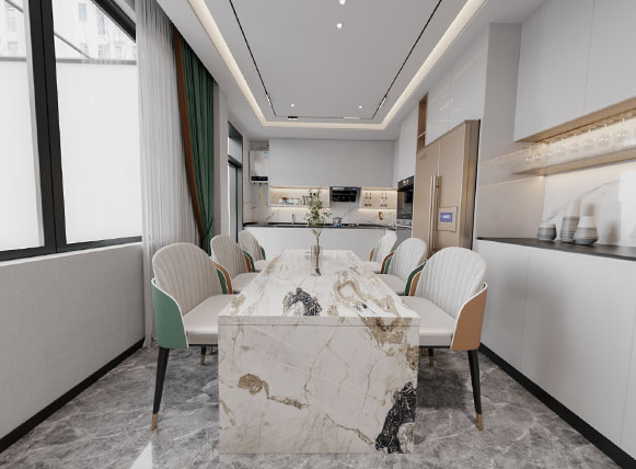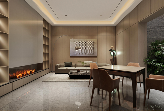 本案為一座580平米的意式輕奢風(fēng)格別墅,將現(xiàn)代簡(jiǎn)約與奢華質(zhì)感完美融合。入戶(hù)區(qū)域便定調(diào)了整個(gè)空間的非凡氣度:對(duì)稱(chēng)式的高大木質(zhì)收納柜沉穩(wěn)大氣,其間形成的通透走廊自然地引導(dǎo)視線(xiàn)向內(nèi)