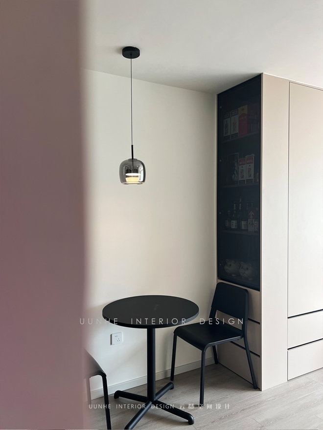 餐桌吊燈+鋼玻裝飾柜形成空間一景