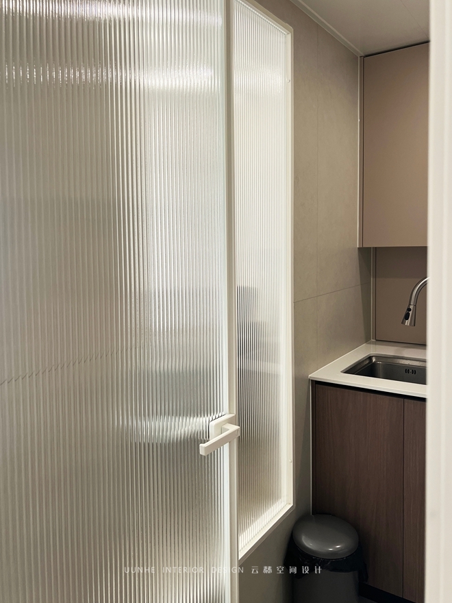 暖灰色系的柜體搭配鋼玻隔斷