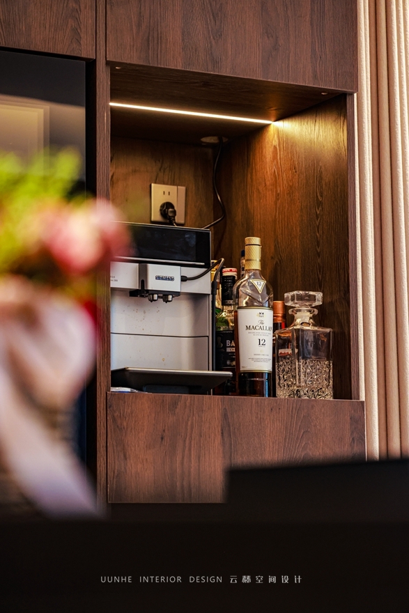 整個案例的主色調(diào)為深灰色與灰色,營造出一種低調(diào)而不失質(zhì)感的氛圍。同時,木紋元素的大量運用,巧妙地凸顯出獨特的風(fēng)格魅力。